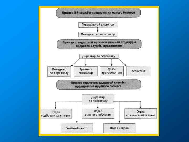 Наиболее характерное выполнение функций УП в организациях разного размера • • Не существует стандартного соотношения между количеством сотрудников службы УП и общим числом сотрудников. Зависит от ряда факторов. В среднем: 1 -2% от численности (чаще 1: 100). 1) В мелких организациях наиболее характерным является осуществление функций УП одним сотрудником (один менеджер по персоналу) или же совмещение должности кадровика с какой-либо другой (секретарь, бухгалтер, юрист). Или же функции по УП выполняют преимущественно линейные руководители. 2) Среднее по численности предприятие требует создания специальной должности и/или специального подразделения по УП: - самостоятельное (может называться по-разному: служба УП, департамент, служба УЧР…); - в рамках какого-нибудь подразделения, например, административного отдела (может быть группа специалистов по УП (2 -4 человека)) Мировой опыт показывает, что «КРИТИЧЕСКОЙ МАССОЙ» , при которой появляется реальная потребность в выделении специальной должности, можно считать наличие в организации 50— 70 сотрудников (средняя организация). Именно в этом случае открытие должности менеджера по персоналу экономически оправдано. 3) Крупная же производственная или коммерческая структура становится перед острой необходимостью создания разветвленной службы УП по различным направлениям деятельности в области человеческих ресурсов, возглавляемой директором по персоналу или заместителем генерального директора (вице-президентом) по УП.