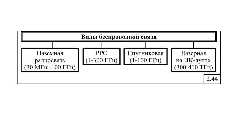 2. 5. 1. Общие принципы организации беспроводной связи Беспроводная связь основана на использовании в качестве информационных сигналов радиоволн или, точнее, электромагнитного поля излучения (ЭПИ). Источниками и приемниками ЭПИ являются разного вида антенны. ВИДЫ беспроводной связи На рис. 2. 44 представлена классификация традиционных видов беспроводной связи.