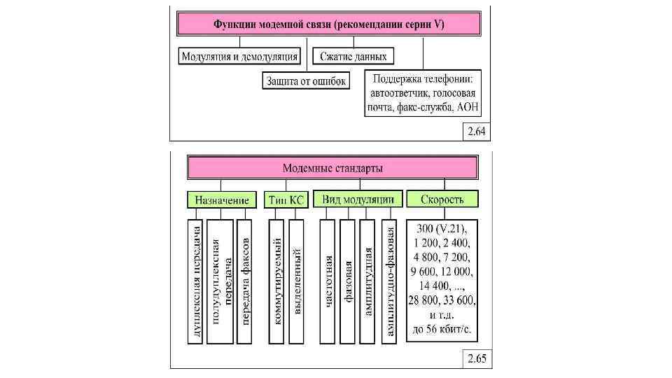 Сжатие данных (data compression) кодирование информации с целью уменьшения её объёма. При передаче данных по телефонному каналу используются средства для автоматической упаковки распаковки данных. Стандарт TAPI (Telephony Application Programming Interface) описывает взаимодействие ПК с телефонной линией и позволяет интегрировать в приложения для ПК обращения к услугам телефонной связи: от простого набора номера до блокировки звонков, переадресации вызовов и конференцсвязи. На рис. 2. 64 перечислены основные функции модемной связи, сформулированные в рекомендациях серии V. 2. 6. 3. Модемные стандарты серии V по передаче данных по телефонным линиям определяют (рис. 2. 65): назначение; тип канала связи; вид модуляции; скорость передачи.