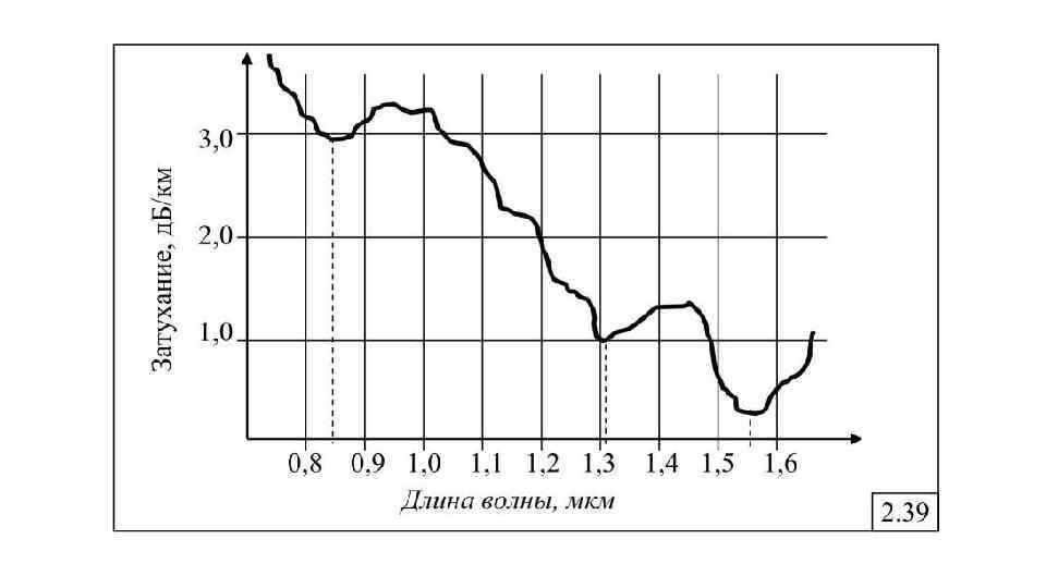 Важнейшими параметрами оптического волокна являются: • затухание; • дисперсия. Затухание определяется потерями на поглощение и рассеяние излучения в оптическом волокне и измеряется в децибелах на километр (д. Б/км). Потери на поглощение зависят от чистоты материала, а потери на рассеяние от неоднородностей его показателя преломления. Затухание зависит и от длины волны излучения, вводимого в волокно. Передача сигналов по оптическому волокну осуществляется в трех диапазонах: 0, 85 мкм, 1, 3 мкм и 1, 55 мкм, так как именно в этих диапазонах кварц имеет повышенную прозрачность (рис. 2. 39). Оптическое волокно характеризуется малым затуханием светового сигнала, составляющем 0, 1 0, 2 д. Б/км при длине волны 1, 55 мкм, что позволяет строить ЛС длиной до нескольких десятков километров без регенерации сигналов. Солитон - уединенная волна, которая не затухает и не поглощается средой, а сохраняет свои размеры и форму сколь угодно долго. Солитон - это световой импульс с необычными свойствами: он сохраняет свою форму и теоретически может распространяться по "идеальному" световоду бесконечно далеко. Длительность импульса составляет примерно 10 пс.