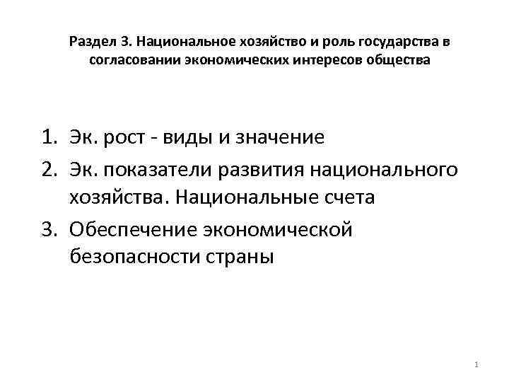 Раздел 3. Национальное хозяйство и роль государства в согласовании экономических интересов общества 1. Эк. рост - виды и значение 2. Эк. показатели развития национального хозяйства. Национальные счета 3. Обеспечение экономической безопасности страны 1