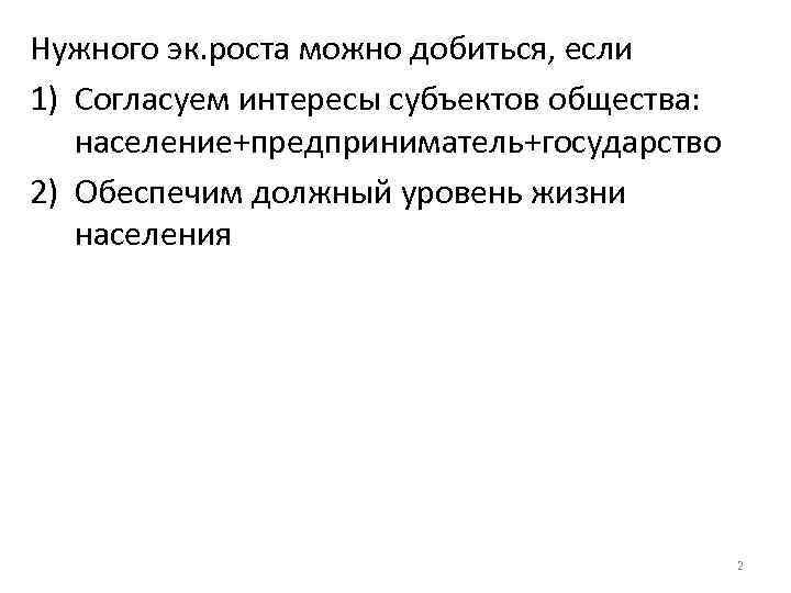 Нужного эк. роста можно добиться, если 1) Согласуем интересы субъектов общества: население+предприниматель+государство 2) Обеспечим должный уровень жизни населения 2