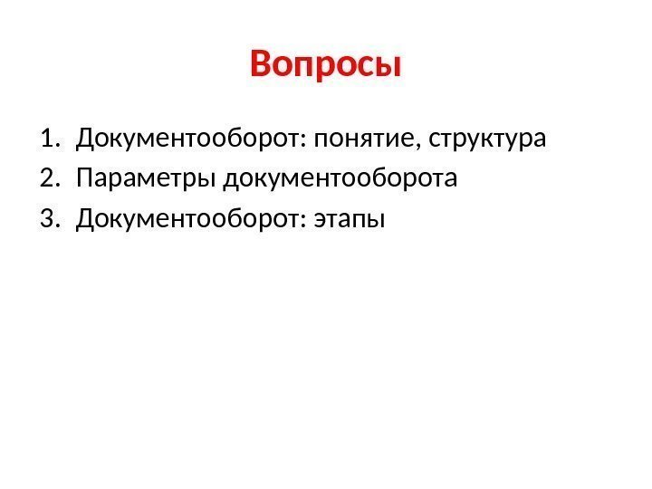 Вопросы 1. Документооборот: понятие, структура 2. Параметры документооборота 3. Документооборот: этапы