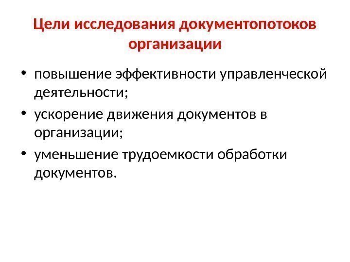 Цели исследования документопотоков организации • повышение эффективности управленческой деятельности; • ускорение движения документов в организации; • уменьшение трудоемкости обработки документов.