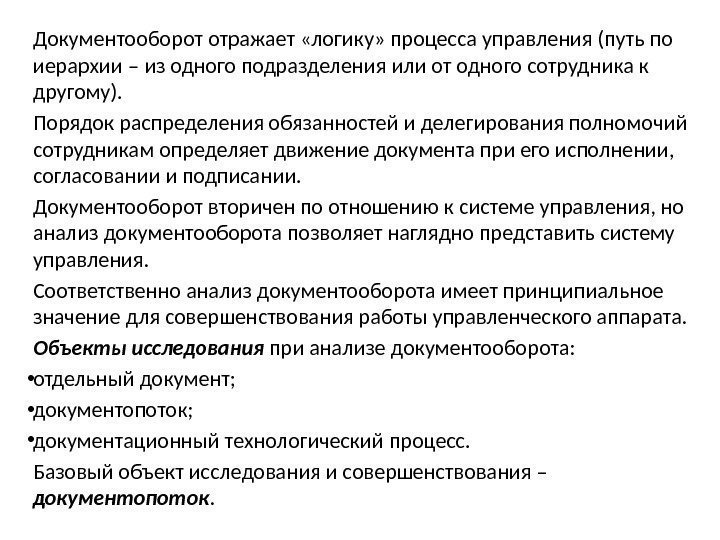 Документооборот отражает «логику» процесса управления (путь по иерархии – из одного подразделения или от одного сотрудника к другому). Порядок распределения обязанностей и делегирования полномочий сотрудникам определяет движение документа при его исполнении, согласовании и подписании. Документооборот вторичен по отношению к системе управления, но анализ документооборота позволяет наглядно представить систему управления. Соответственно анализ документооборота имеет принципиальное значение для совершенствования работы управленческого аппарата. Объекты исследования при анализе документооборота: • отдельный документ; • документопоток; • документационный технологический процесс. Базовый объект исследования и совершенствования – документопоток.