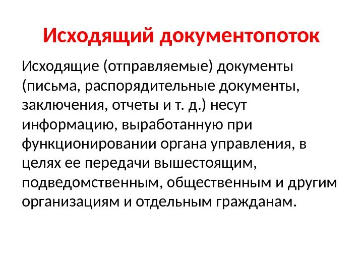 Исходящий документопоток Исходящие (отправляемые) документы (письма, распорядительные документы, заключения, отчеты и т. д. ) несут информацию, выработанную при функционировании органа управления, в целях ее передачи вышестоящим, подведомственным, общественным и другим организациям и отдельным гражданам.
