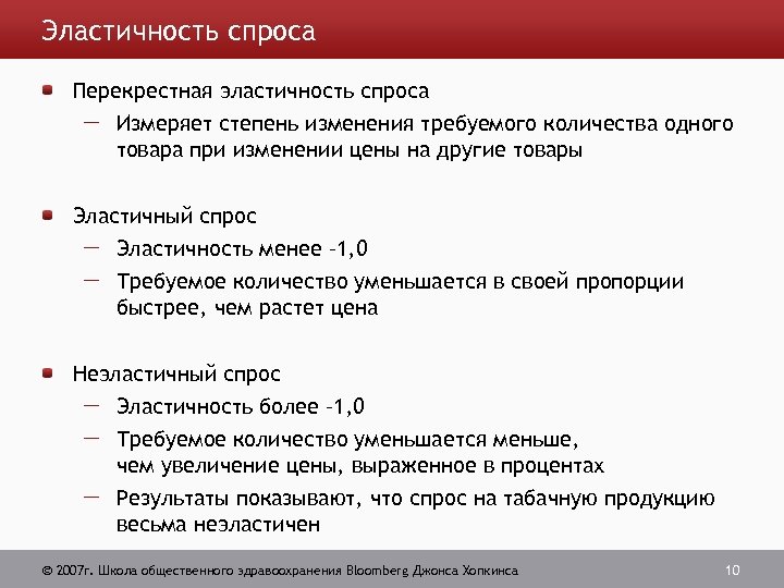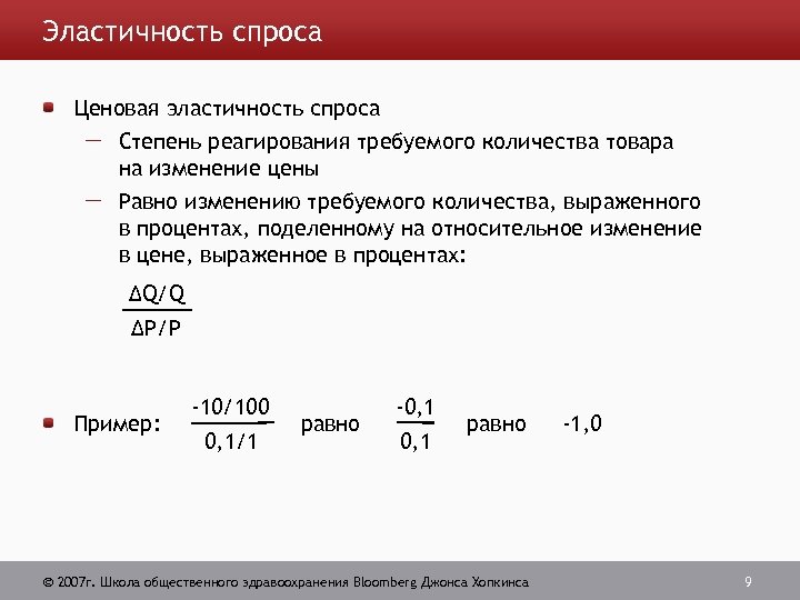 Эластичность спроса Ценовая эластичность спроса Степень реагирования требуемого количества товара на изменение цены Равно изменению требуемого количества, выраженного в процентах, поделенному на относительное изменение в цене, выраженное в процентах: ΔQ/Q ΔP/P Пример: -10/100 0, 1/1 равно -0, 1 равно 2007 г. Школа общественного здравоохранения Bloomberg Джонса Хопкинса -1, 0 9
