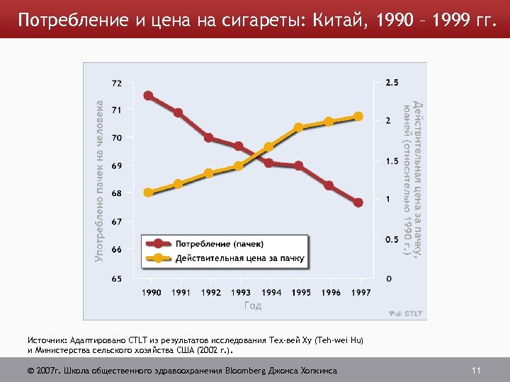 Потребление и цена на сигареты: Китай, 1990 – 1999 гг. Источник: Aдаптировано CTLT из результатов исследования Тех-вей Ху (Teh-wei Hu) и Министерства сельского хозяйства США (2002 г. ). 2007 г. Школа общественного здравоохранения Bloomberg Джонса Хопкинса 11
