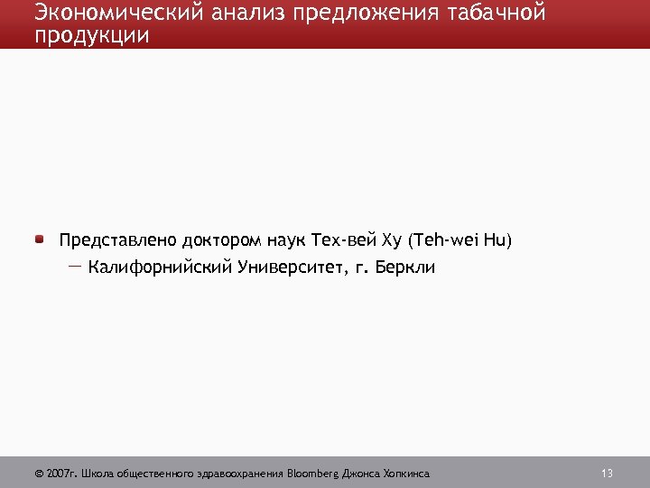 Экономический анализ предложения табачной продукции Представлено доктором наук Тех-вей Ху (Teh-wei Hu) Калифорнийский Университет, г. Беркли 2007 г. Школа общественного здравоохранения Bloomberg Джонса Хопкинса 13
