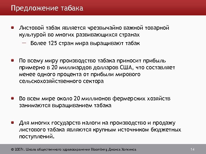 Предложение табака Листовой табак является чрезвычайно важной товарной культурой во многих развивающихся странах Более 125 стран мира выращивают табак По всему миру производство табака приносит прибыль примерно в 20 миллиардов долларов США, что составляет менее одного процента от прибыли мирового сельскохозяйственного сектора Во всем мире около 20 миллионов фермерских хозяйств занимаются выращиванием табака Для многих государств налоги на производство и продажу листового табака являются крупным источником бюджетных поступлений. 2007 г. Школа общественного здравоохранения Bloomberg Джонса Хопкинса 14