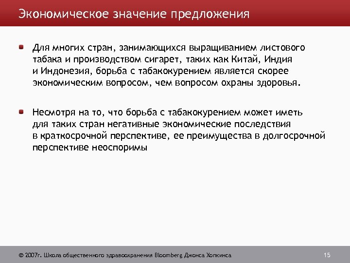 Экономическое значение предложения Для многих стран, занимающихся выращиванием листового табака и производством сигарет, таких как Китай, Индия и Индонезия, борьба с табакокурением является скорее экономическим вопросом, чем вопросом охраны здоровья. Несмотря на то, что борьба с табакокурением может иметь для таких стран негативные экономические последствия в краткосрочной перспективе, ее преимущества в долгосрочной перспективе неоспоримы 2007 г. Школа общественного здравоохранения Bloomberg Джонса Хопкинса 15