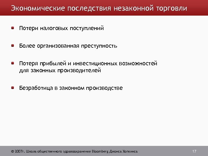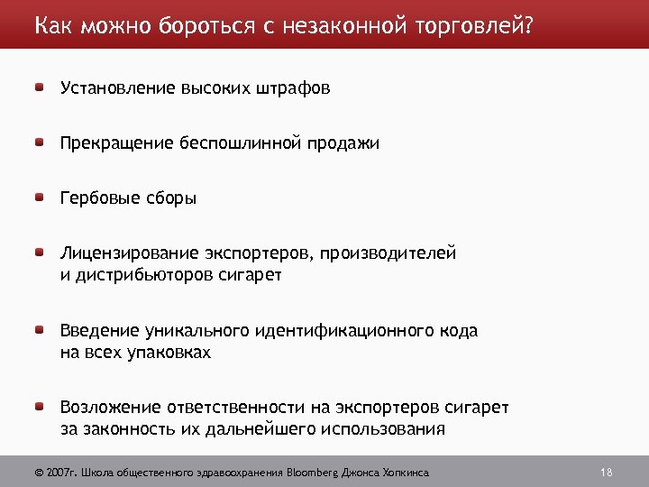 Экономические последствия незаконной торговли Потери налоговых поступлений Более организованная преступность Потеря прибылей и инвестиционных возможностей для законных производителей Безработица в законном производстве 2007 г. Школа общественного здравоохранения Bloomberg Джонса Хопкинса 17