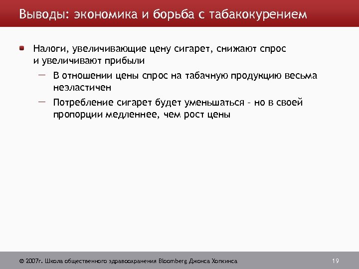 Выводы: экономика и борьба с табакокурением Налоги, увеличивающие цену сигарет, снижают спрос и увеличивают прибыли В отношении цены спрос на табачную продукцию весьма неэластичен Потребление сигарет будет уменьшаться – но в своей пропорции медленнее, чем рост цены 2007 г. Школа общественного здравоохранения Bloomberg Джонса Хопкинса 19