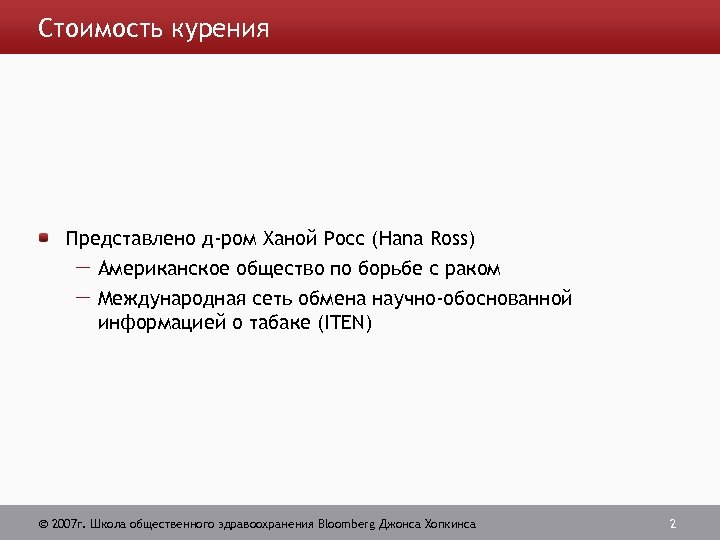 Стоимость курения Представлено д-ром Ханой Росс (Hana Ross) Американское общество по борьбе с раком Международная сеть обмена научно-обоснованной информацией о табаке (ITEN) 2007 г. Школа общественного здравоохранения Bloomberg Джонса Хопкинса 2