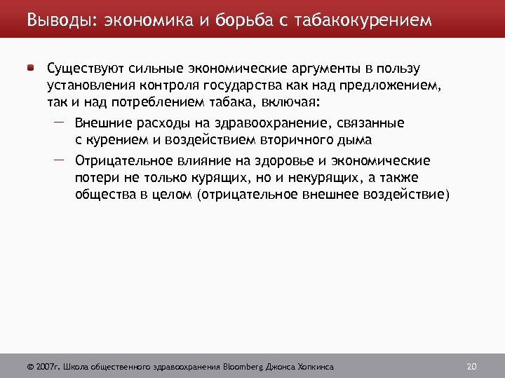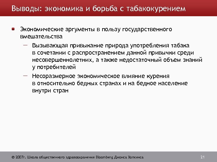Выводы: экономика и борьба с табакокурением Существуют сильные экономические аргументы в пользу установления контроля государства как над предложением, так и над потреблением табака, включая: Внешние расходы на здравоохранение, связанные с курением и воздействием вторичного дыма Отрицательное влияние на здоровье и экономические потери не только курящих, но и некурящих, а также общества в целом (отрицательное внешнее воздействие) 2007 г. Школа общественного здравоохранения Bloomberg Джонса Хопкинса 20