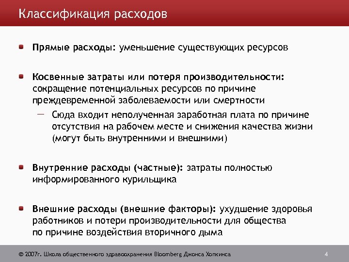 Перспективы оценки затрат Общество Самая всесторонняя перспектива Отдельные лица и домашние хозяйства Государственный бюджет Предприятия и работники 2007 г. Школа общественного здравоохранения Bloomberg Джонса Хопкинса 3