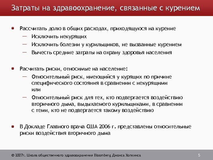 Классификация расходов Прямые расходы: уменьшение существующих ресурсов Косвенные затраты или потеря производительности: сокращение потенциальных ресурсов по причине преждевременной заболеваемости или смертности Сюда входит неполученная заработная плата по причине отсутствия на рабочем месте и снижения качества жизни (могут быть внутренними и внешними) Внутренние расходы (частные): затраты полностью информированного курильщика Внешние расходы (внешние факторы): ухудшение здоровья работников и потери производительности для общества по причине воздействия вторичного дыма 2007 г. Школа общественного здравоохранения Bloomberg Джонса Хопкинса 4