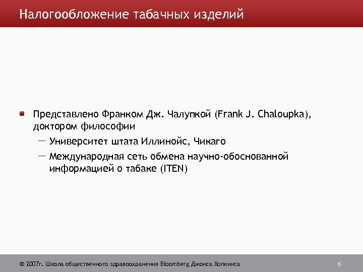 Налогообложение табачных изделий Представлено Франком Дж. Чалупкой (Frank J. Chaloupka), доктором философии Университет штата Иллинойс, Чикаго Международная сеть обмена научно-обоснованной информацией о табаке (ITEN) 2007 г. Школа общественного здравоохранения Bloomberg Джонса Хопкинса 6