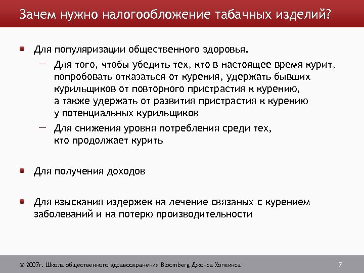 Зачем нужно налогообложение табачных изделий? Для популяризации общественного здоровья. Для того, чтобы убедить тех, кто в настоящее время курит, попробовать отказаться от курения, удержать бывших курильщиков от повторного пристрастия к курению, а также удержать от развития пристрастия к курению у потенциальных курильщиков Для снижения уровня потребления среди тех, кто продолжает курить Для получения доходов Для взыскания издержек на лечение связаных с курением заболеваний и на потерю производительности 2007 г. Школа общественного здравоохранения Bloomberg Джонса Хопкинса 7