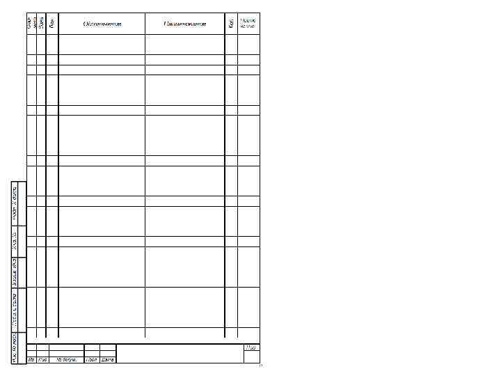 Спецификацию изделий при плазовом методе производства составляют по формам 2 и 2 а приложения А. Графы «Формат» , «Зона» , «Поз. » , «Обозначение» , «Кол. » и «При мечание» заполняют по правилам, указанным для формы 1. В графе «Наименование» в разделе «Детали» для деталей, на которые не выпущены чертежи, указывают только наименование деталей. В остальных разделах графу заполняют аналогично правилам, указанным для формы 1. Графы «Масса» и «Материал» заполняют следующим образом — в графе «Масса» указывают: для деталей, на которые не выпущены чертежи, —массу одной детали; для материалов — массу материала на данное специфицируемое изделие; — в графе «Материал» для деталей, на которые не выпущены чертежи, указывают обозначения материалов, установленные в стандартах и технических условиях на эти материалы. Примечание — для деталей, на которые выпущены чертежи, графы «Масса» и «Материалы» заполнять не допускается.