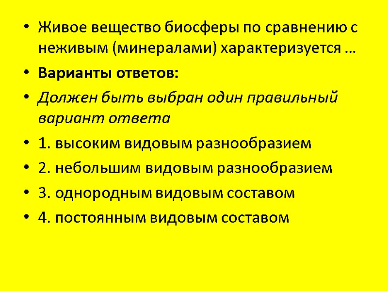 Живое вещество биосферы по сравнению с неживым (минералами) характеризуется … Варианты ответов: Должен быть выбран один правильный вариант ответа 1. высоким видовым разнообразием 2. небольшим видовым разнообразием 3. однородным видовым составом 4. постоянным видовым составом
