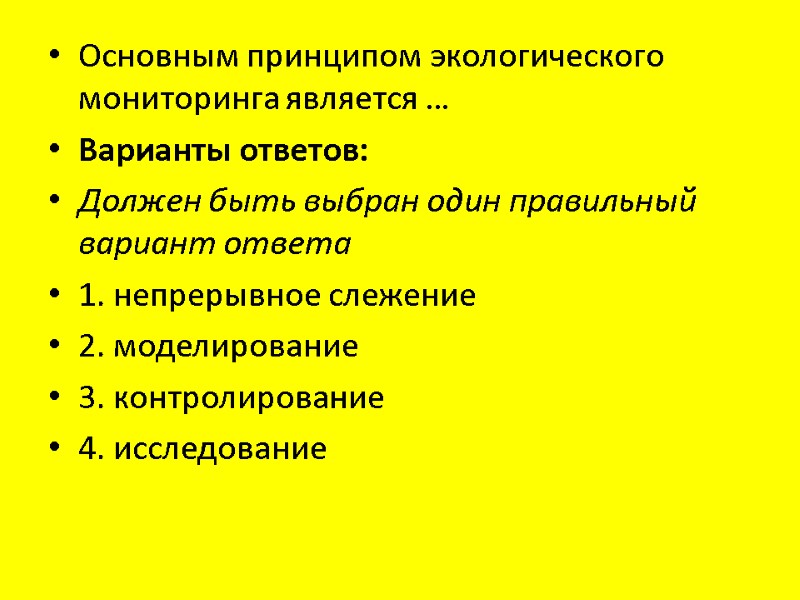 Основным принципом экологического мониторинга является … Варианты ответов: Должен быть выбран один правильный вариант ответа 1. непрерывное слежение 2. моделирование 3. контролирование 4. исследование