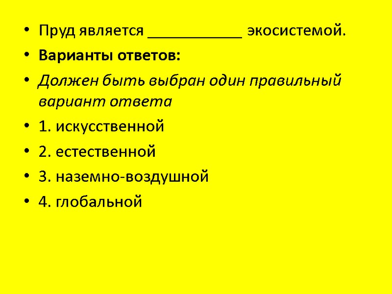 Пруд является ___________ экосистемой. Варианты ответов: Должен быть выбран один правильный вариант ответа 1. искусственной 2. естественной 3. наземно-воздушной 4. глобальной