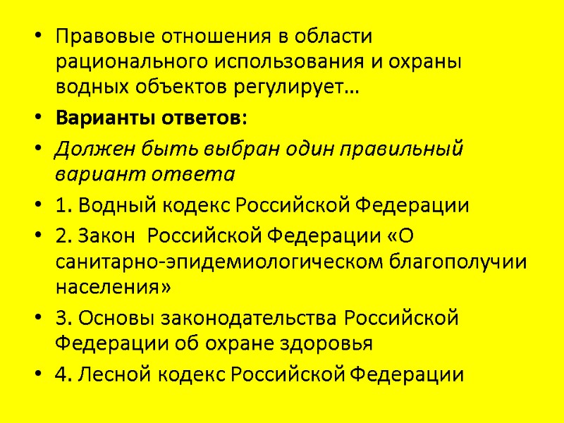Правовые отношения в области рационального использования и охраны водных объектов регулирует… Варианты ответов: Должен быть выбран один правильный вариант ответа 1. Водный кодекс Российской Федерации 2. Закон Российской Федерации «О санитарно-эпидемиологическом благополучии населения» 3. Основы законодательства Российской Федерации об охране здоровья 4. Лесной кодекс Российской Федерации