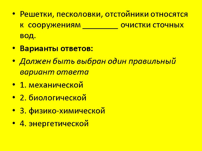 Решетки, песколовки, отстойники относятся к сооружениям ________ очистки сточных вод. Варианты ответов: Должен быть выбран один правильный вариант ответа 1. механической 2. биологической 3. физико-химической 4. энергетической
