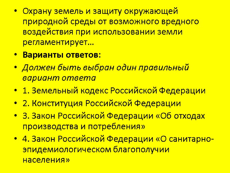 Охрану земель и защиту окружающей природной среды от возможного вредного воздействия при использовании земли регламентирует… Варианты ответов: Должен быть выбран один правильный вариант ответа 1. Земельный кодекс Российской Федерации 2. Конституция Российской Федерации 3. Закон Российской Федерации «Об отходах производства и потребления» 4. Закон Российской Федерации «О санитарно-эпидемиологическом благополучии населения»