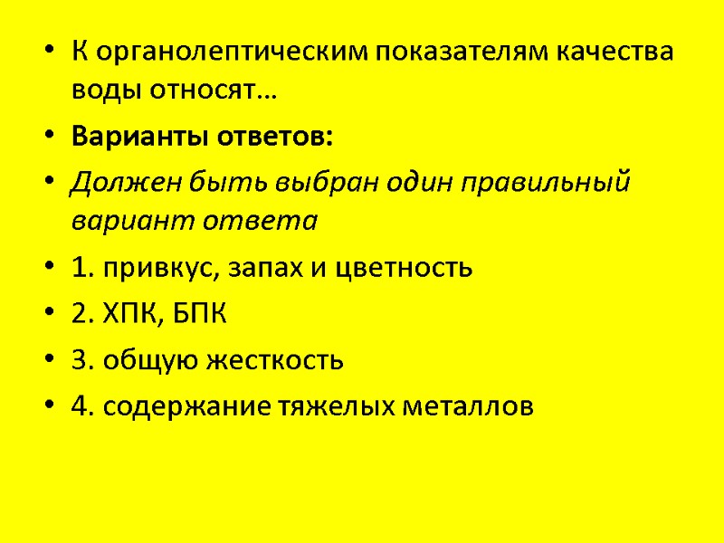К органолептическим показателям качества воды относят… Варианты ответов: Должен быть выбран один правильный вариант ответа 1. привкус, запах и цветность 2. ХПК, БПК 3. общую жесткость 4. содержание тяжелых металлов