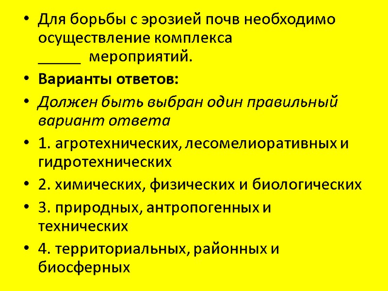 Для борьбы с эрозией почв необходимо осуществление комплекса _____ мероприятий. Варианты ответов: Должен быть выбран один правильный вариант ответа 1. агротехнических, лесомелиоративных и гидротехнических 2. химических, физических и биологических 3. природных, антропогенных и технических 4. территориальных, районных и биосферных