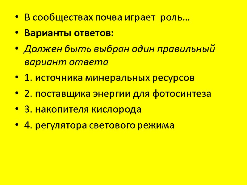 В сообществах почва играет роль… Варианты ответов: Должен быть выбран один правильный вариант ответа 1. источника минеральных ресурсов 2. поставщика энергии для фотосинтеза 3. накопителя кислорода 4. регулятора светового режима