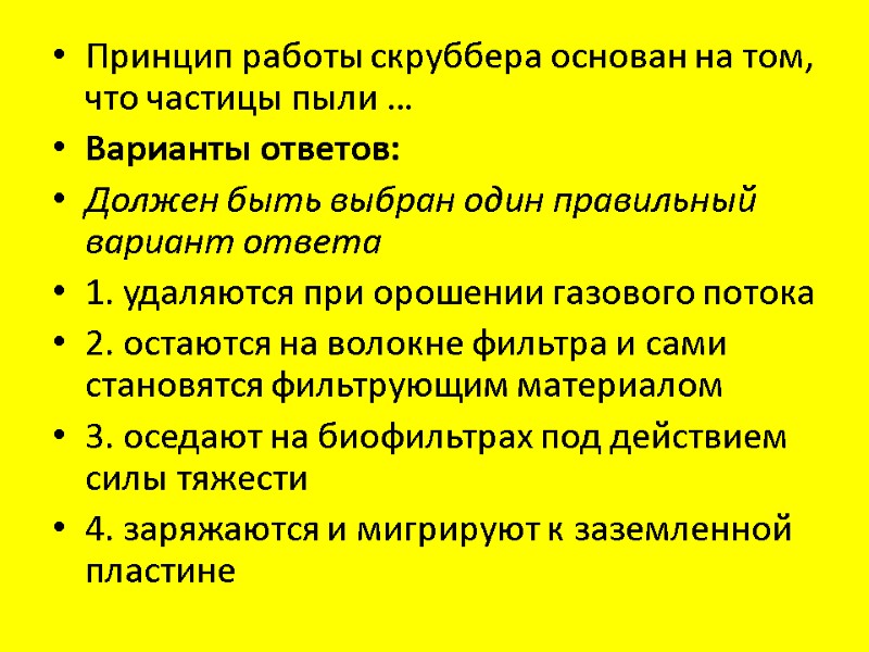 Принцип работы скруббера основан на том, что частицы пыли … Варианты ответов: Должен быть выбран один правильный вариант ответа 1. удаляются при орошении газового потока 2. остаются на волокне фильтра и сами становятся фильтрующим материалом 3. оседают на биофильтрах под действием силы тяжести 4. заряжаются и мигрируют к заземленной пластине