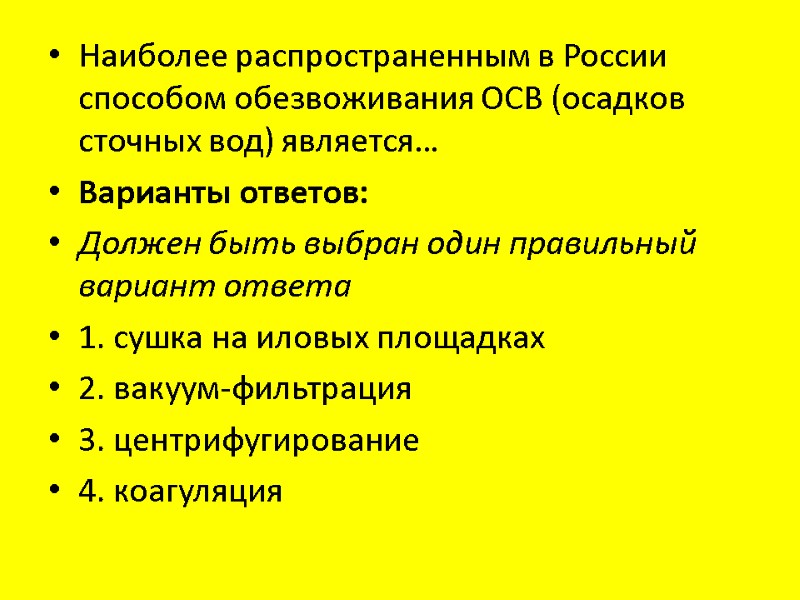 Наиболее распространенным в России способом обезвоживания ОСВ (осадков сточных вод) является… Варианты ответов: Должен быть выбран один правильный вариант ответа 1. сушка на иловых площадках 2. вакуум-фильтрация 3. центрифугирование 4. коагуляция