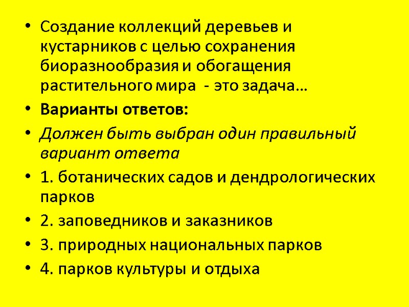 Создание коллекций деревьев и кустарников с целью сохранения биоразнообразия и обогащения растительного мира - это задача… Варианты ответов: Должен быть выбран один правильный вариант ответа 1. ботанических садов и дендрологических парков 2. заповедников и заказников 3. природных национальных парков 4. парков культуры и отдыха