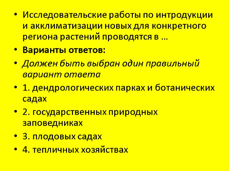 Исследовательские работы по интродукции и акклиматизации новых для конкретного региона растений проводятся в … Варианты ответов: Должен быть выбран один правильный вариант ответа 1. дендрологических парках и ботанических садах 2. государственных природных заповедниках 3. плодовых садах 4. тепличных хозяйствах