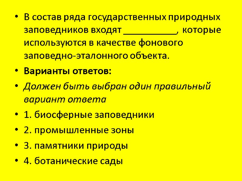 В состав ряда государственных природных заповедников входят __________, которые используются в качестве фонового заповедно-эталонного объекта. Варианты ответов: Должен быть выбран один правильный вариант ответа 1. биосферные заповедники 2. промышленные зоны 3. памятники природы 4. ботанические сады