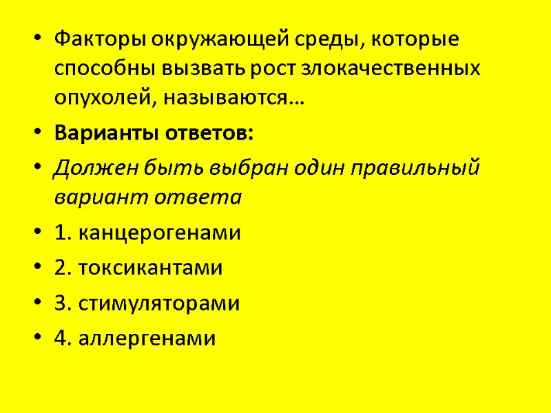 Факторы окружающей среды, которые способны вызвать рост злокачественных опухолей, называются… Варианты ответов: Должен быть выбран один правильный вариант ответа 1. канцерогенами 2. токсикантами 3. стимуляторами 4. аллергенами