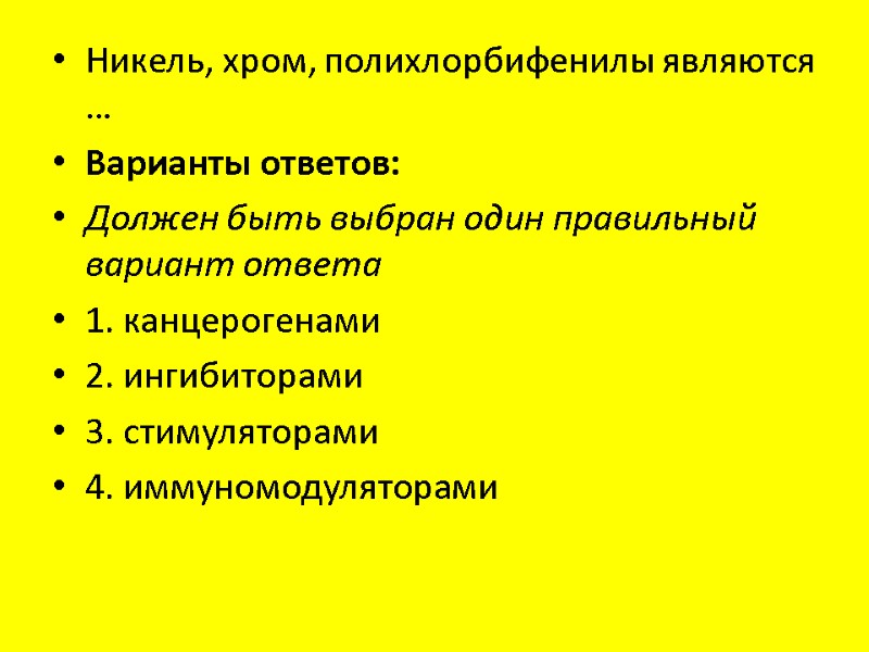 Никель, хром, полихлорбифенилы являются … Варианты ответов: Должен быть выбран один правильный вариант ответа 1. канцерогенами 2. ингибиторами 3. стимуляторами 4. иммуномодуляторами