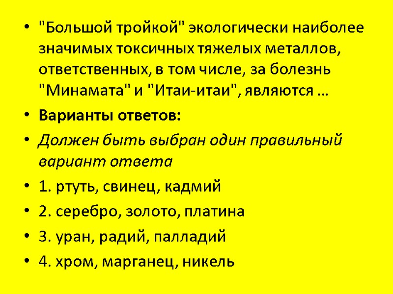 "Большой тройкой" экологически наиболее значимых токсичных тяжелых металлов, ответственных, в том числе, за болезнь "Минамата" и "Итаи-итаи", являются … Варианты ответов: Должен быть выбран один правильный вариант ответа 1. ртуть, свинец, кадмий 2. серебро, золото, платина 3. уран, радий, палладий 4. хром, марганец, никель