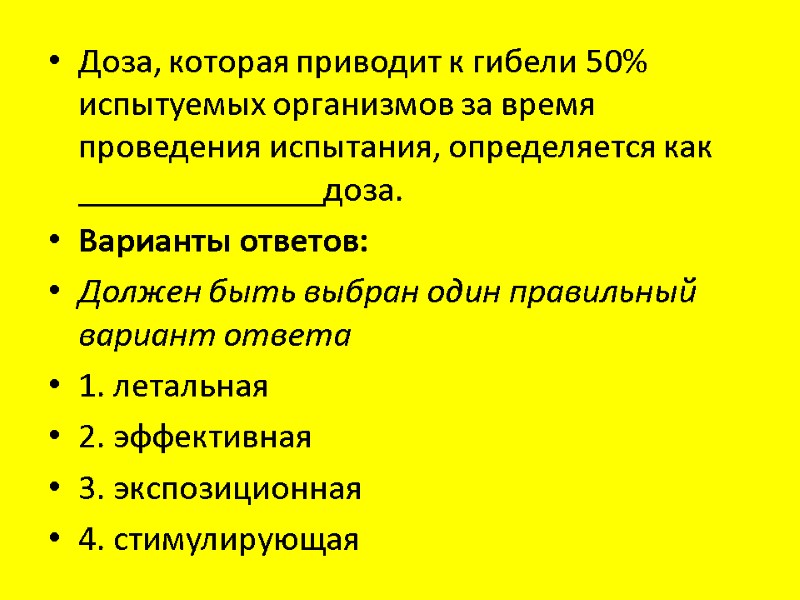 Доза, которая приводит к гибели 50% испытуемых организмов за время проведения испытания, определяется как ______________доза. Варианты ответов: Должен быть выбран один правильный вариант ответа 1. летальная 2. эффективная 3. экспозиционная 4. стимулирующая