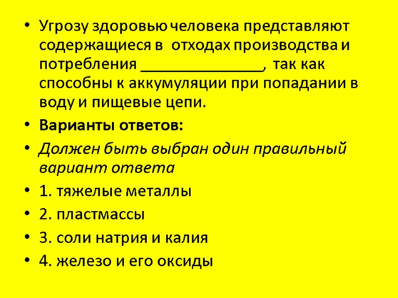 Угрозу здоровью человека представляют содержащиеся в отходах производства и потребления ______________, так как способны к аккумуляции при попадании в воду и пищевые цепи. Варианты ответов: Должен быть выбран один правильный вариант ответа 1. тяжелые металлы 2. пластмассы 3. соли натрия и калия 4. железо и его оксиды
