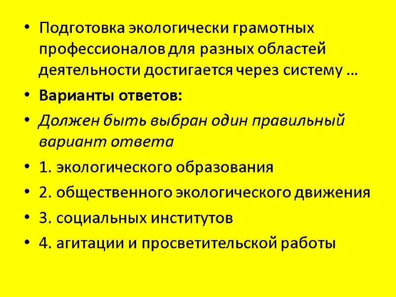 Подготовка экологически грамотных профессионалов для разных областей деятельности достигается через систему … Варианты ответов: Должен быть выбран один правильный вариант ответа 1. экологического образования 2. общественного экологического движения 3. социальных институтов 4. агитации и просветительской работы