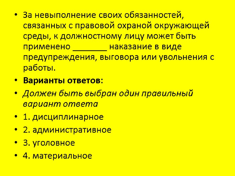 За невыполнение своих обязанностей, связанных с правовой охраной окружающей среды, к должностному лицу может быть применено _______ наказание в виде предупреждения, выговора или увольнения с работы. Варианты ответов: Должен быть выбран один правильный вариант ответа 1. дисциплинарное 2. административное 3. уголовное 4. материальное