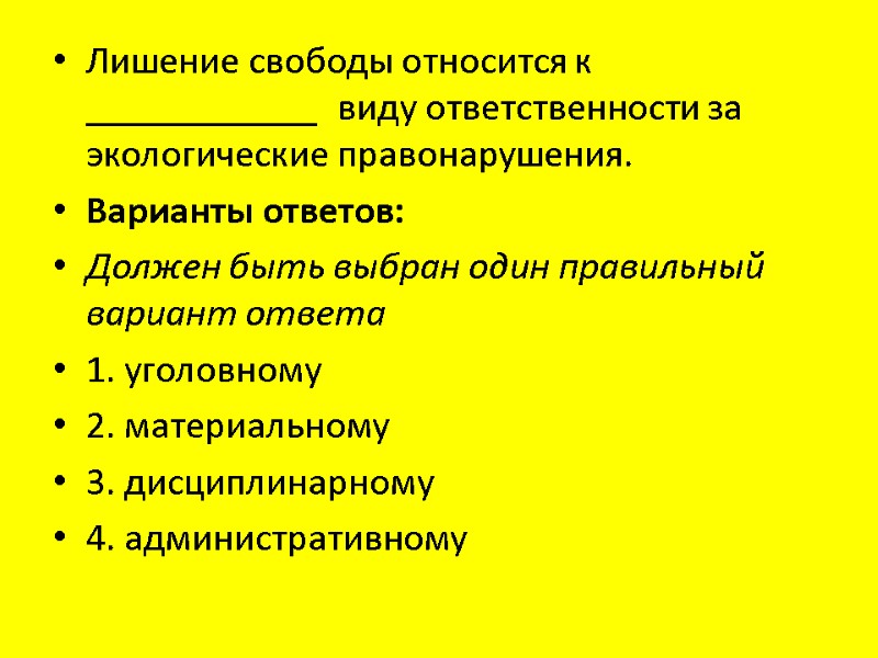 Лишение свободы относится к ____________ виду ответственности за экологические правонарушения. Варианты ответов: Должен быть выбран один правильный вариант ответа 1. уголовному 2. материальному 3. дисциплинарному 4. административному