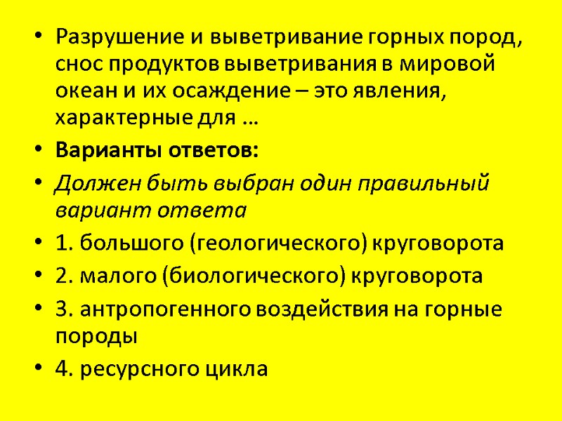 Разрушение и выветривание горных пород, снос продуктов выветривания в мировой океан и их осаждение – это явления, характерные для … Варианты ответов: Должен быть выбран один правильный вариант ответа 1. большого (геологического) круговорота 2. малого (биологического) круговорота 3. антропогенного воздействия на горные породы 4. ресурсного цикла