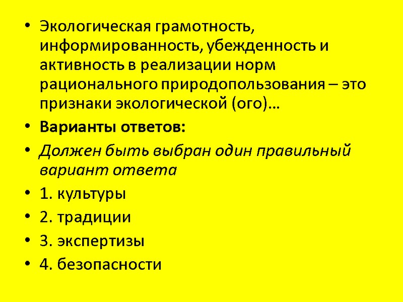 Экологическая грамотность, информированность, убежденность и активность в реализации норм рационального природопользования – это признаки экологической (ого)… Варианты ответов: Должен быть выбран один правильный вариант ответа 1. культуры 2. традиции 3. экспертизы 4. безопасности