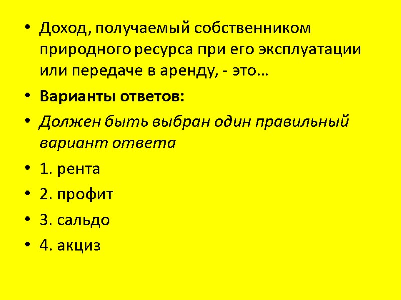 Доход, получаемый собственником природного ресурса при его эксплуатации или передаче в аренду, - это… Варианты ответов: Должен быть выбран один правильный вариант ответа 1. рента 2. профит 3. сальдо 4. акциз