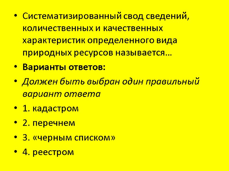 Систематизированный свод сведений, количественных и качественных характеристик определенного вида природных ресурсов называется… Варианты ответов: Должен быть выбран один правильный вариант ответа 1. кадастром 2. перечнем 3. «черным списком» 4. реестром